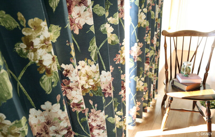 ディズニーホームシリーズ 〜アジサイ〜 ダークブルー 【撮影カーテン仕様】ヒダ数:標準1.5倍ヒダ(2つ山) クラシカルな雰囲気が漂う、アジサイの花が上品なドレープカーテン。