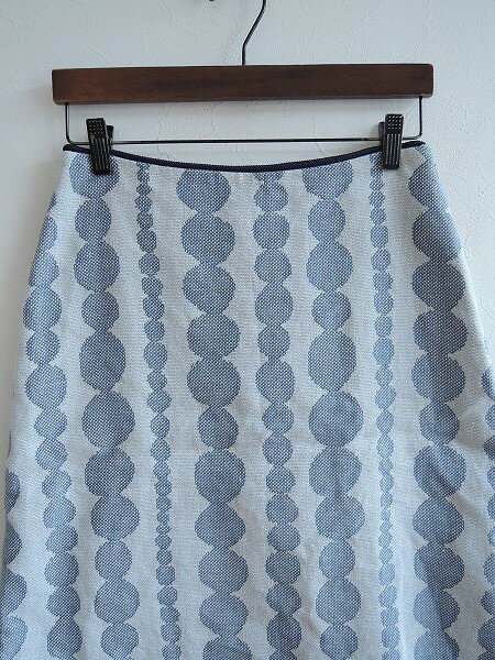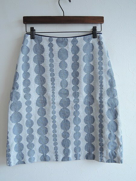 表記サイズ:36 実寸サイズ:ウエスト幅33cm, ヒップ幅43cm, 着丈57cm (多少の誤差はご了承ください) 素材:麻60%,綿40% 裏地-キュプラ100% デザイン:mina perhonenのkemuri 台形スカートです。